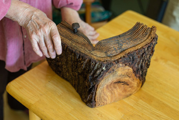 Christine Langerhorst is al sinds 1959 creatief houtbewerkster. De laatste tijd zijn het vooral boekvormen die onder haar handen ontstaan. Het zijn boeken die het verhaal van een boom vertellen, van wat hij heeft meegemaakt en geleden. De merktekens van dit lijden vormen patronen die bij het bewerken zichtbaar worden. De boom zelf heeft deze wonden al in schoonheid omgezet, waar Christine door het zagen, snijden, draaien en schuren de perfecte uitdrukking aan geeft.